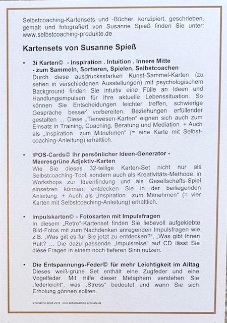 Kartensets, Geschichten & Audios - entwickelt, gestaltet, geschrieben, gemalt, illustriert, fotografiert von Dipl. Psych. Susanne Spieß, Institutsleiterin IPOS